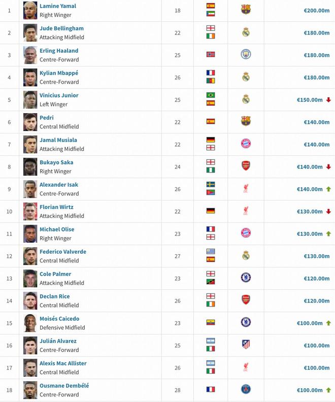 更新英超和德甲球员身价,目前德国转会市场上有18名球员身价超过1亿欧元。五个主要联赛中,只有意甲联赛没有球员上榜。莫伊塞斯·凯塞多的身价达到1亿欧元,福登的身价下降至8000万欧元,罗德里的身价从1.1亿欧元下降至9000万欧元,奥利塞的身价从1亿欧元增加至1.3亿欧元。 1. 亚马尔巴塞罗那 2 亿欧元 2. 贝灵汉姆 皇家马德里 1.8 亿欧元 3. 哈兰德 曼城 1.8 亿欧元 4. 姆巴佩 皇家马德里 1.8 亿欧元 5. 维尼修斯 皇家马德里 1.5 亿欧元 6. 佩德里巴塞罗那 1.4 亿欧元 7. 穆夏拉 拜仁慕尼黑 1.4 亿欧元 8. 利物浦 1.4 亿欧元 10.维尔茨利物浦 1.3亿欧元 11.奥利塞 拜仁慕尼黑 1.3亿欧元 12.巴尔韦德 皇马 1.3亿欧元 13.帕尔默 切尔西 1.2亿欧元 14.赖斯 阿森纳 1.2亿欧元15.莫伊塞斯·凯塞多 切尔西 1亿欧元 16.阿尔瓦雷斯 1亿欧元 18.登贝莱 巴黎圣日耳曼 1亿欧元
